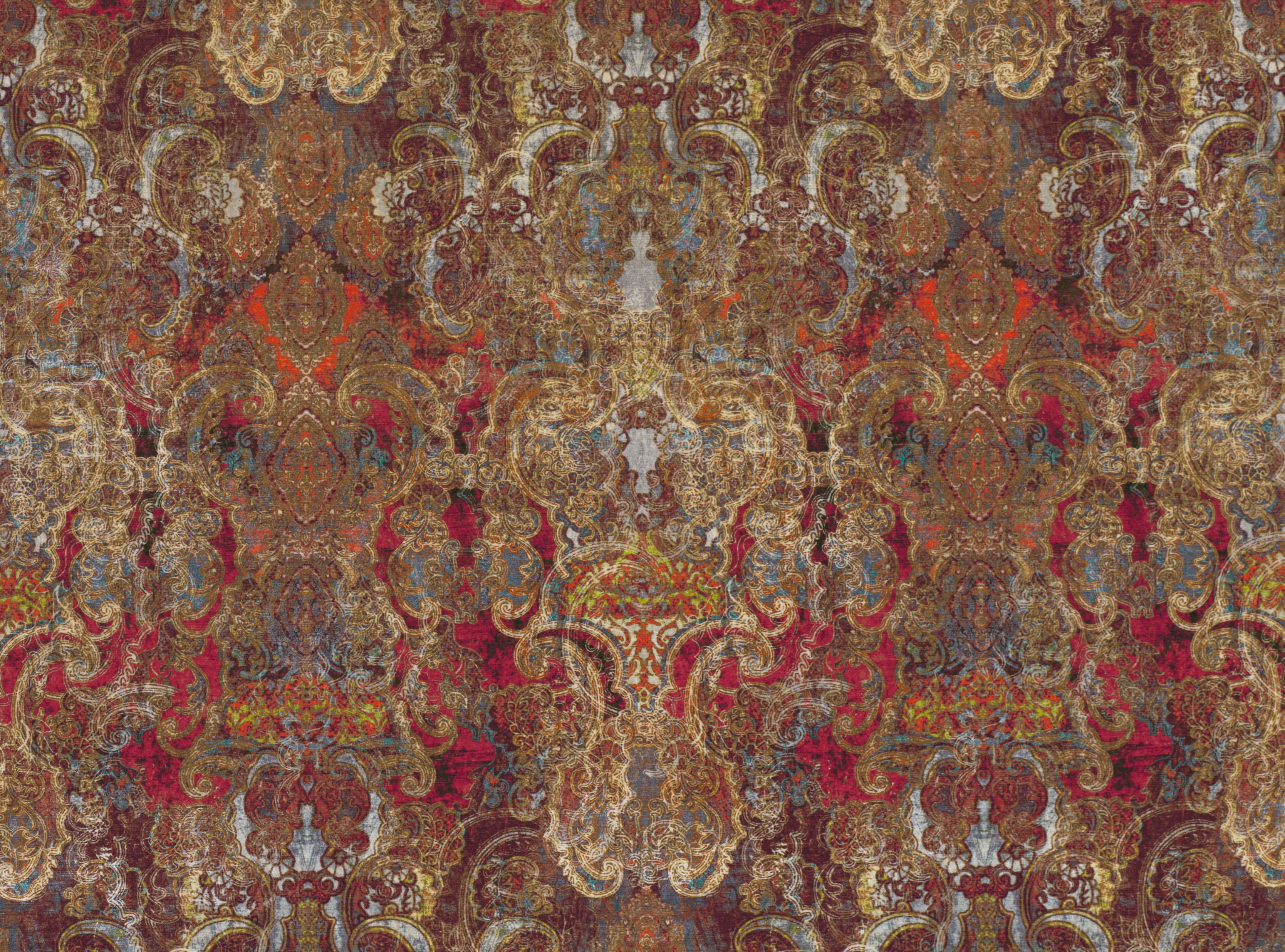 Raffinierte Lagen und sorgfältig ausgearbeitete Details, bewusst positioniert um einen großgemusterten, marokkanisch inspirierten Damast, digital gedruckt auf feinem Viskose Samt.