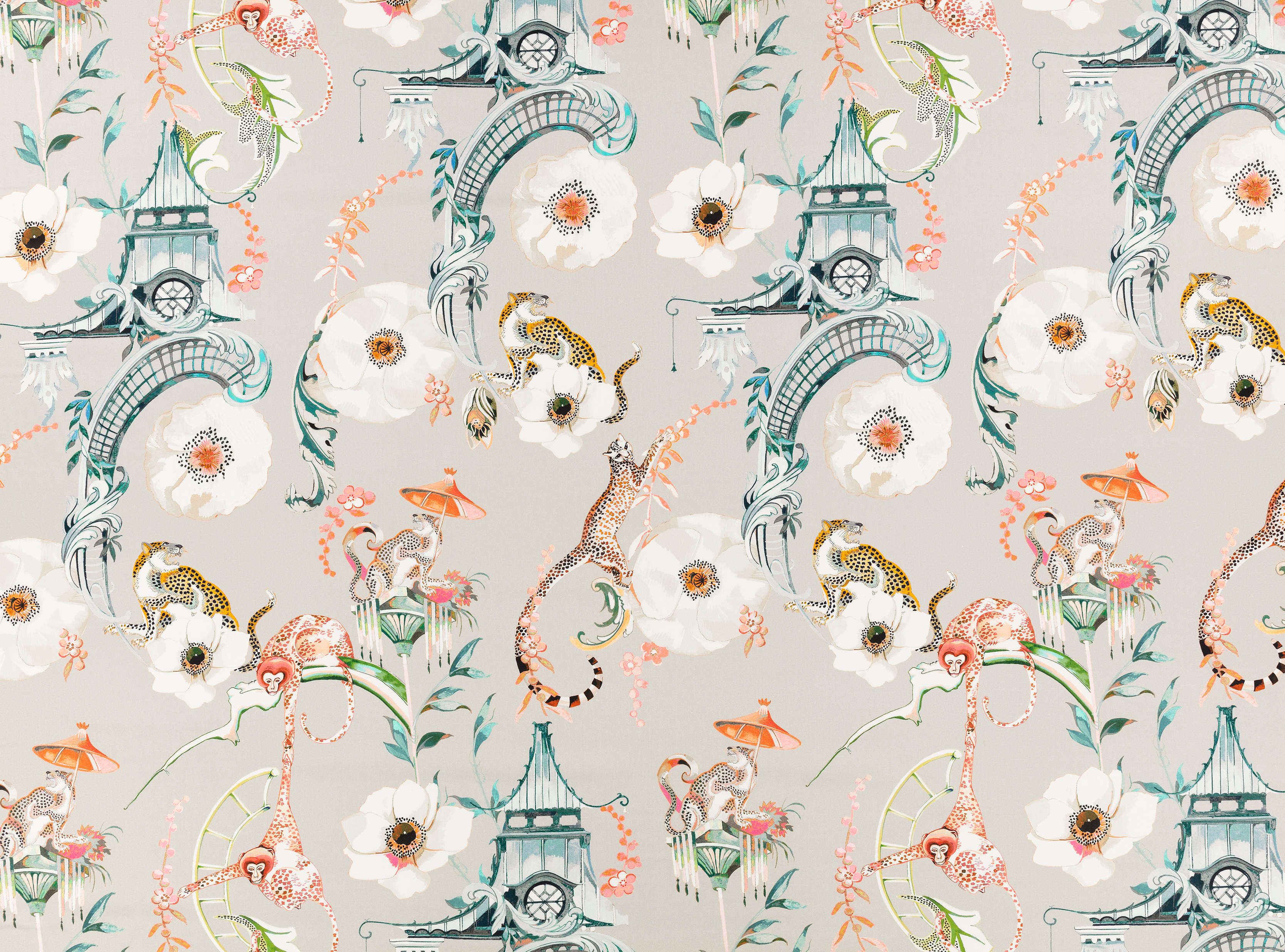 Ein berauschender Print, der eine Geschichte von Sonnenschirmen, Leoparden und schelmischen, schwingenden Affen in einer Welt von Chinoiserie-inspirierten Szenen erzählt. Der Stoff Euphorie ist eine Utopie des spielerischen Ausdrucks, der es erlaubt, die Realität loszulassen und neue Wunderländer zu erkunden, die der Kreativität freien Lauf lassen. Inspiriert von eleganten Satinkleidern aus dem Temperley-Archiv fängt der raffiniert bedruckte Baumwollsatin jedes komplizierte Detail und die subtilen Nuancen des originalen handgemalten Kunstwerks sowie die schönen Farbtöne ein."
