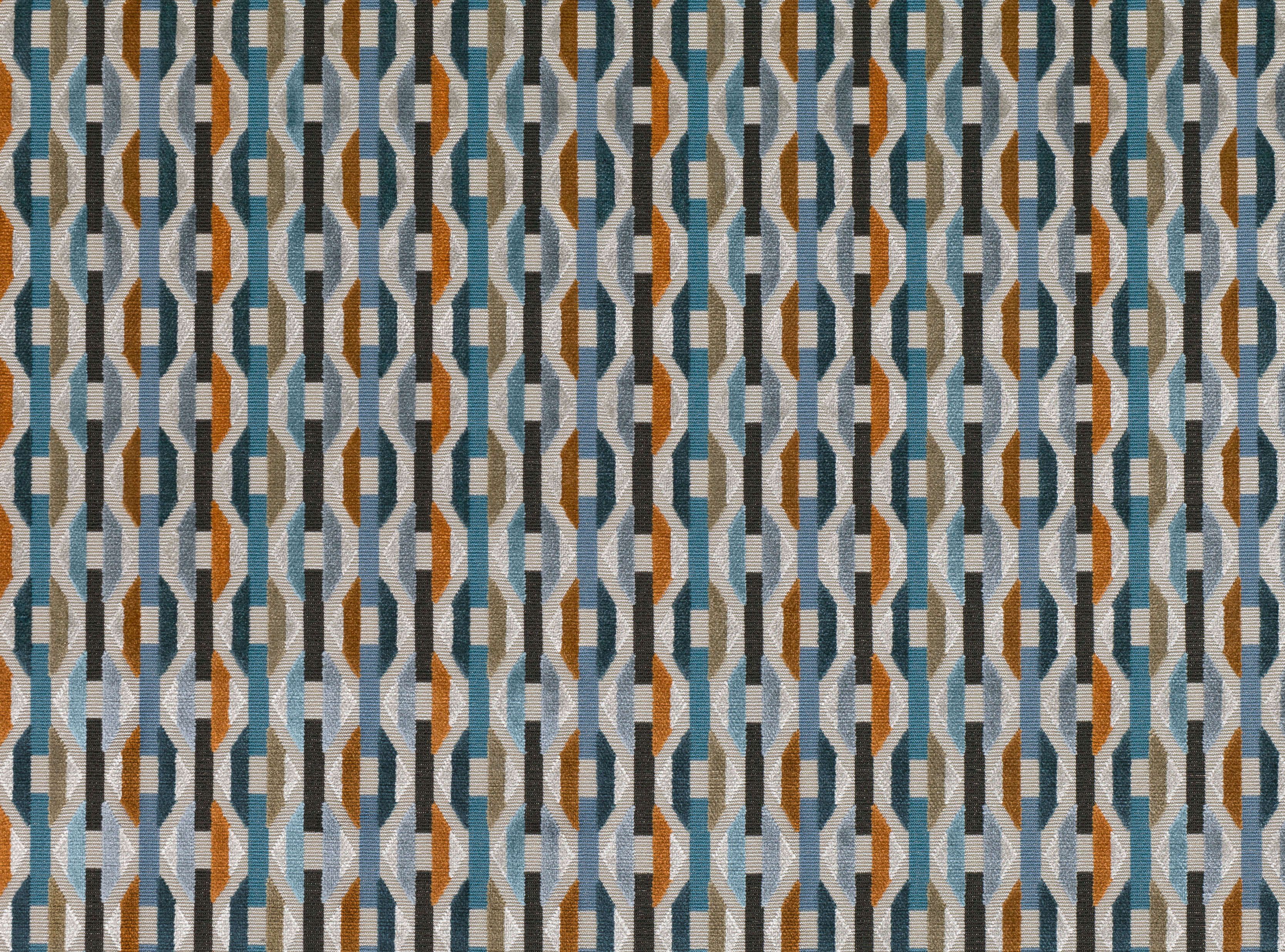 Lebhaftes, ineinander greifendes geometrisches Muster auf geschnittenem und ungeschnittenem Samt, mit wunderbarer Haptik und reicher, opulenter Farbtiefe.