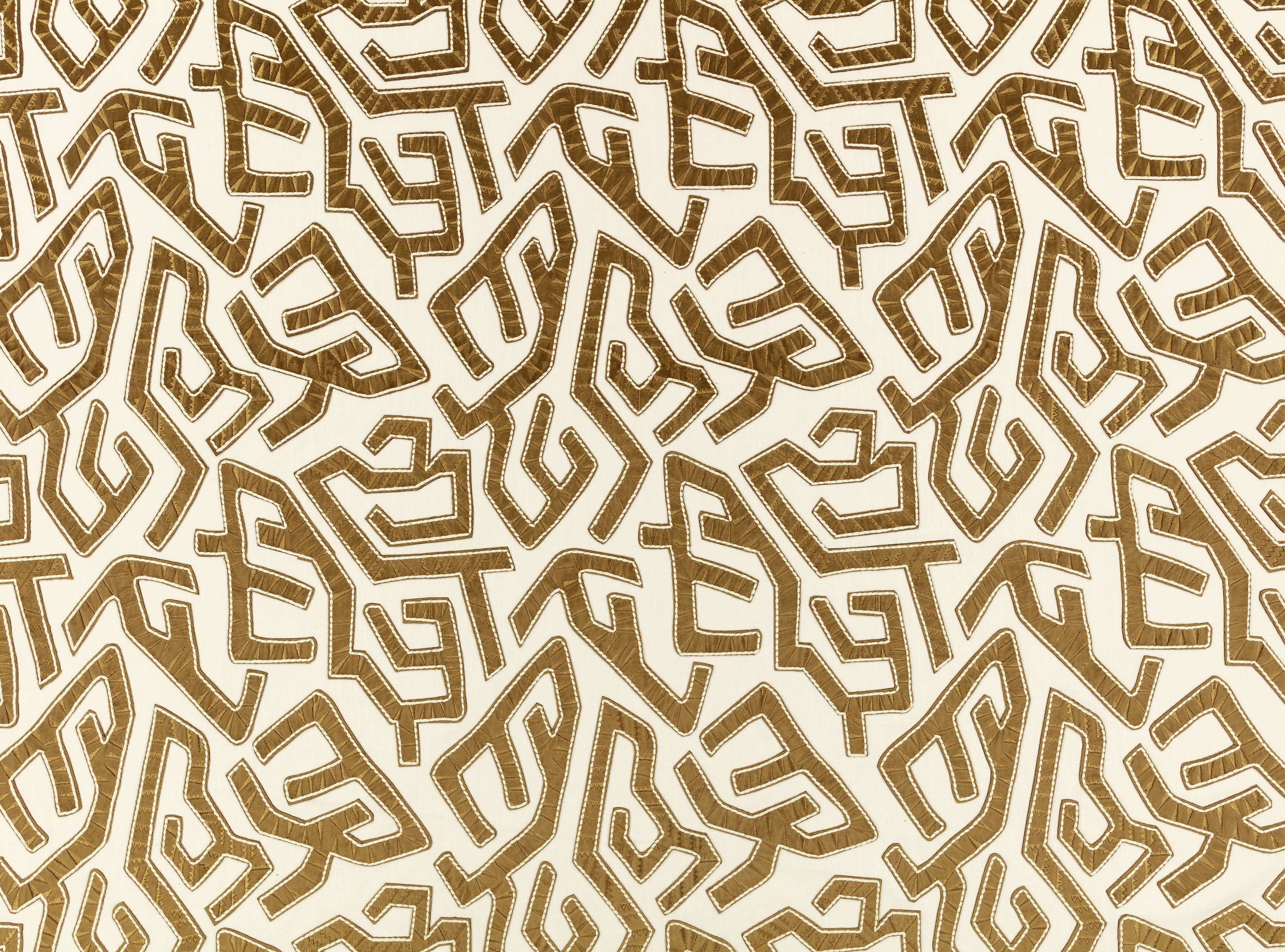 Eine innovative Interpretation eines labyrinthartigen Design, Streifen aus texturiertem Velours mit Stichdetails werden auf einen entspannten Leinengrund aufgebracht.