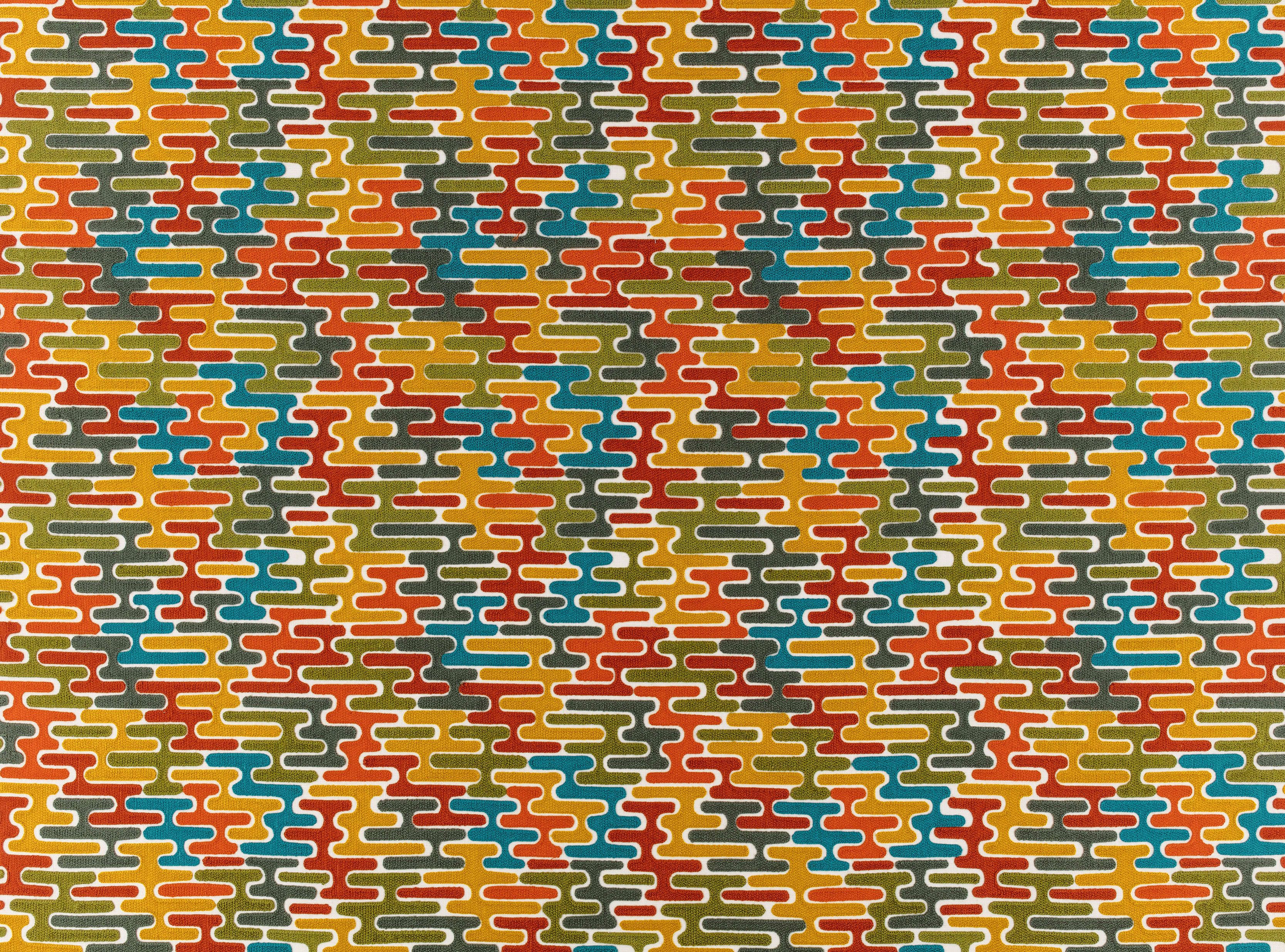Die kurvigen Formen der Crewel-Stickerei fügen sich wie Puzzleteile zusammen, um dieses großflächige, moderne und dennoch rustikale Design mit seinen fein gewählten Farbkombinationen zu schaffen.