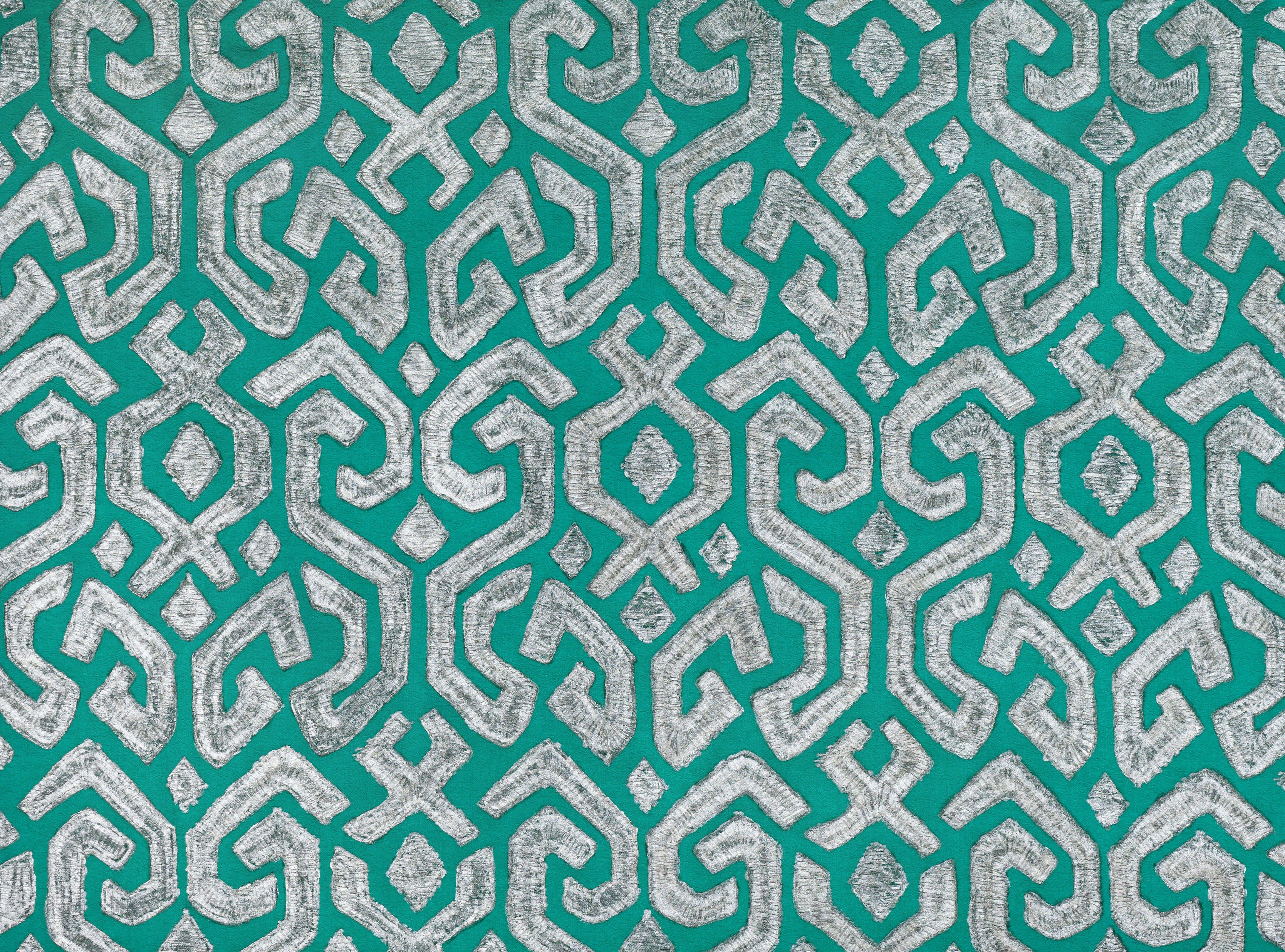 Mit ausdrucksstarken Farben und frechen Mustern ist Dammuso eine Reflektion der rauen Elemente auf der Vulkaninsel Pantelleria. Erinnernd an einen Folklore Druck, wird das grobe Wabendesign in tiefen Juwelentönen gewebt und später handbemalt mit luxuriösen Metallics.