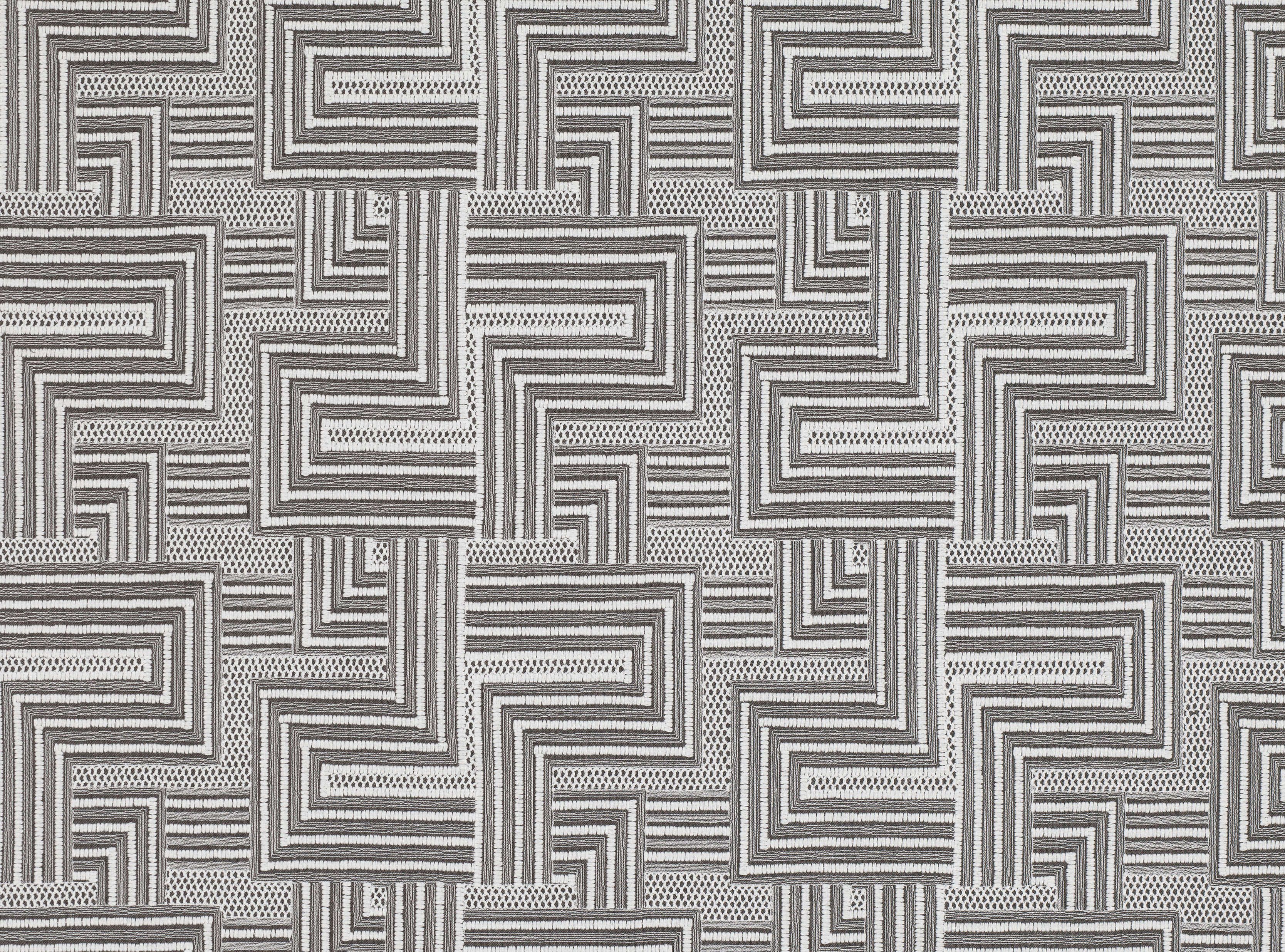 Modernes, Labyrinth-artiges Design, bestickt mit einer besonderen Technik. Das Ergebnis erinnert an die per Hand geknotete Struktur von Macramé.