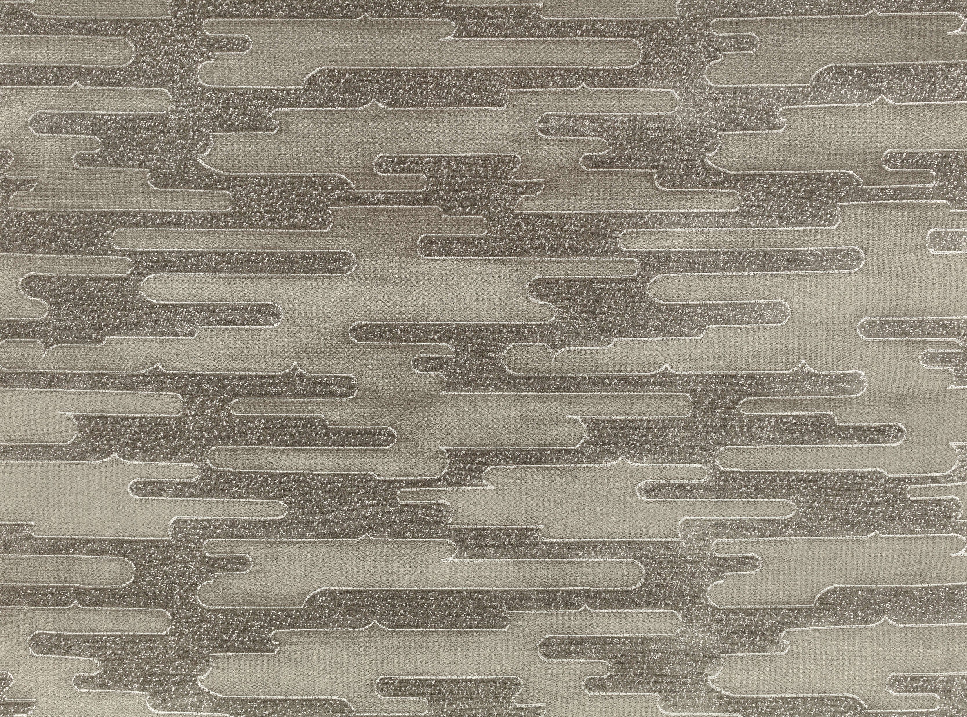 Inspiriert von der gesprenkelten Ästhetik von Travertin ergeben monochrome Paarungen und unterschiedliche Samtlängen eine großformatige horizontale Grafik.